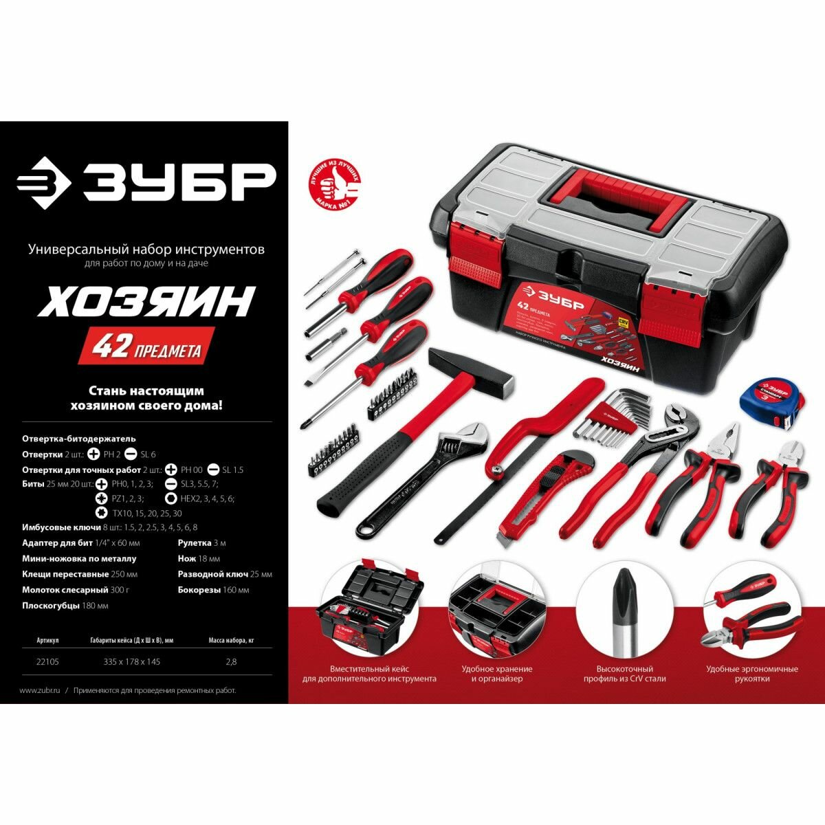 Набор инструмента Зубр 22105, Хозяин-42 для дома, 42 предмета Зубр 9623047 .