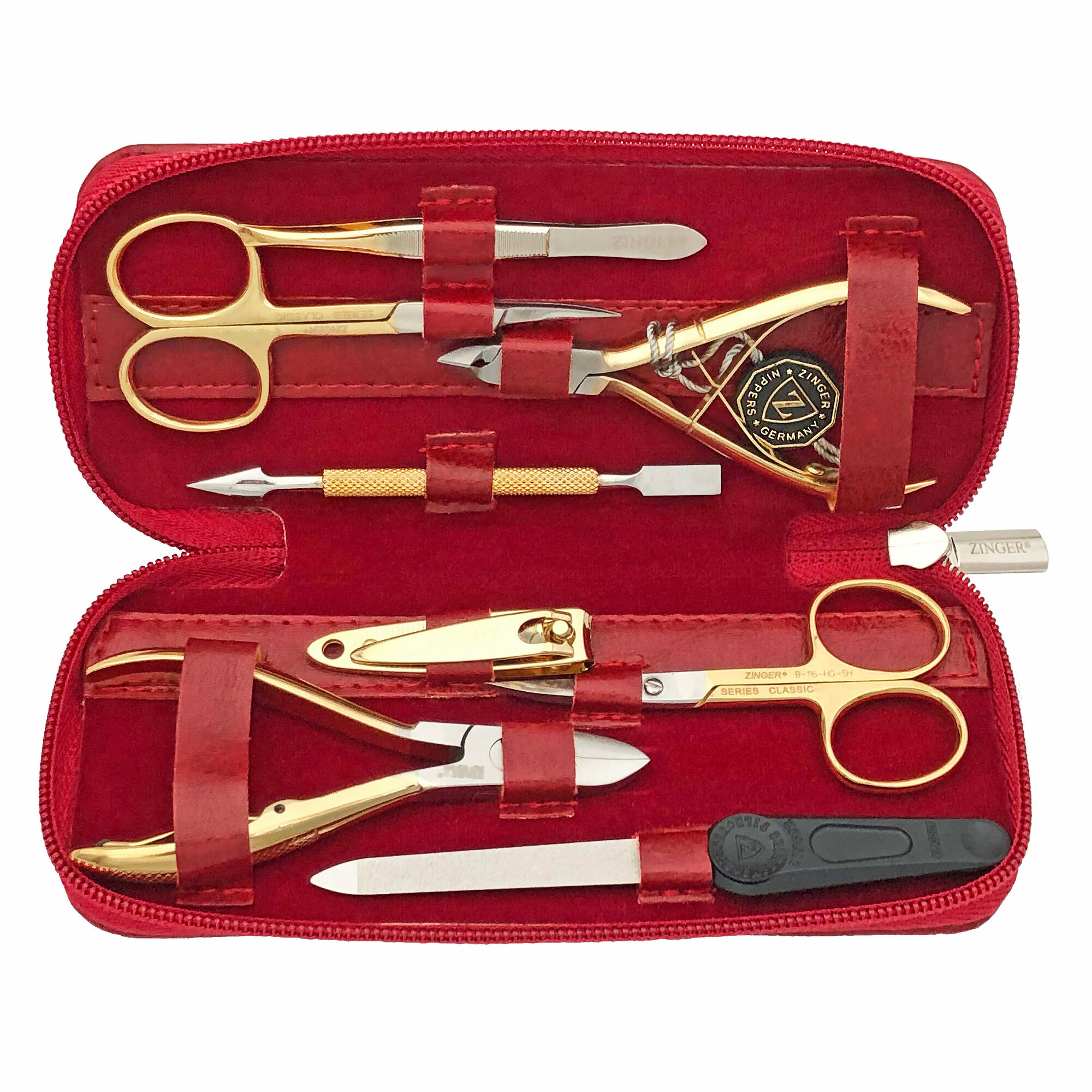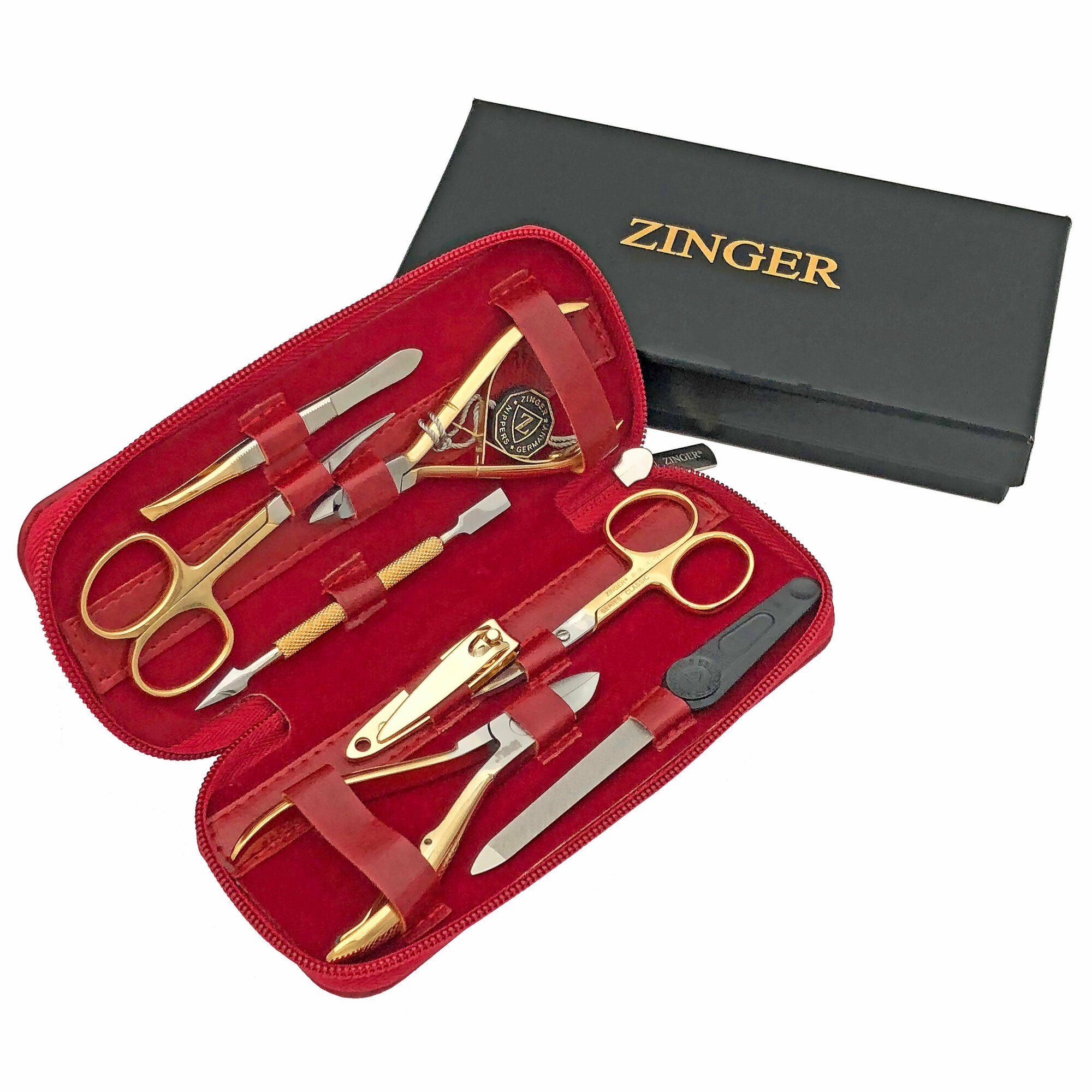 Маникюрный набор Zinger 7106 G, 8 предметов, позолоченный/красный лак