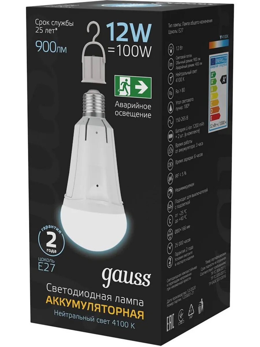 Аварийная лампа Gauss A80 12W 900lm 4100K Е27 с Li-Ion аккуммулятором LED 1/5/50 102002212