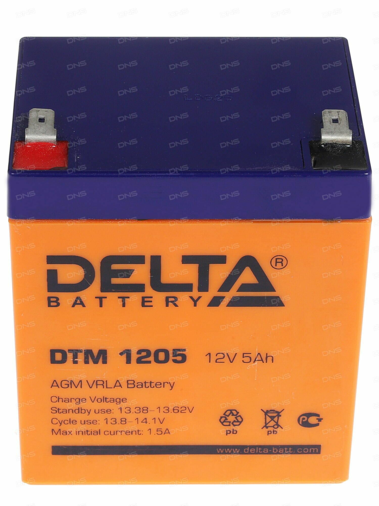 Батарея DELTA серия DTM, DTM 1205, напряжение 12В, емкость 5Ач (разряд 20 часов), макс. ток разряда (5 сек.) 75А, макс. ток заряда 1.5А, свинцово-кислотная типа AGM, клеммы F2, ДxШxВ 90х70х101мм., вес 1.8кг., срок службы 6 лет. Delta UPS DTM 1205 (12V /