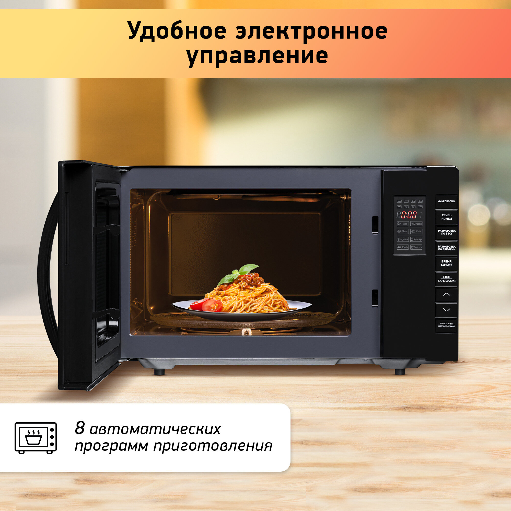 материал поворотного стола - стекло; материал передней панели - стекло; быстрый старт; встроенные часы; энергопотребление - 1250 Вт; количество рецептов автоподогрева: 8; количество режимов авторазморозки: 2