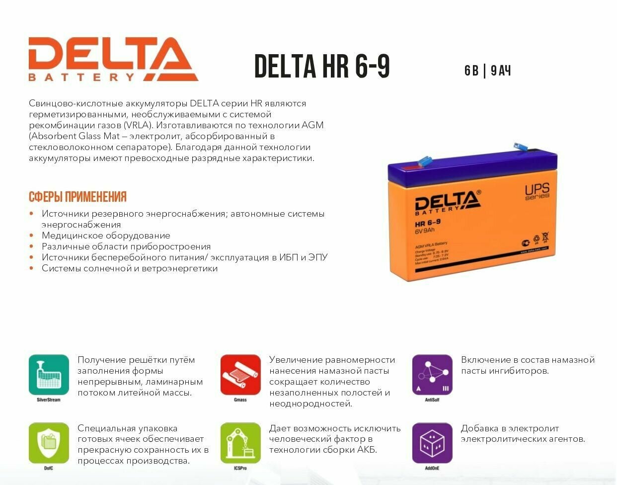 Ниже Вы можете прочитать отзывы на Батарея DELTA серия HR, HR 6-9, напряжение 6В, емкость 9Ач (разряд 20 часов), макс. ток разряда (5 сек.) 135А, макс. ток заряда 2.55А, свинцово-кислотная типа AGM, клеммы F1, ДxШxВ 151х34х94мм., вес 1.37кг., срок службы 8 лет. Delta UPS HR 6-9 (6V / 9Ah), ознакомится с подробными характеристиками, посмотреть интересные обзоры и фотографии на Батарея DELTA серия HR, HR 6-9, напряжение 6В, емкость 9Ач (разряд 20 часов), макс. ток разряда (5 сек.) 135А, макс. ток заряда 2.55А, свинцово-кислотная типа AGM, клеммы F1, ДxШxВ 151х34х94мм., вес 1.37кг., срок службы 8 лет. Delta UPS HR 6-9 (6V / 9Ah).