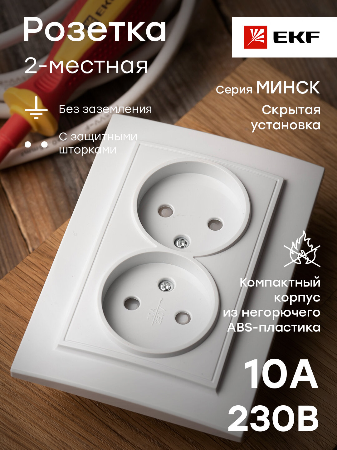 Розетка EKF Basic Минск 2-местная, скрытой установки, без заземления, с защитной шторкой, 10А, белая