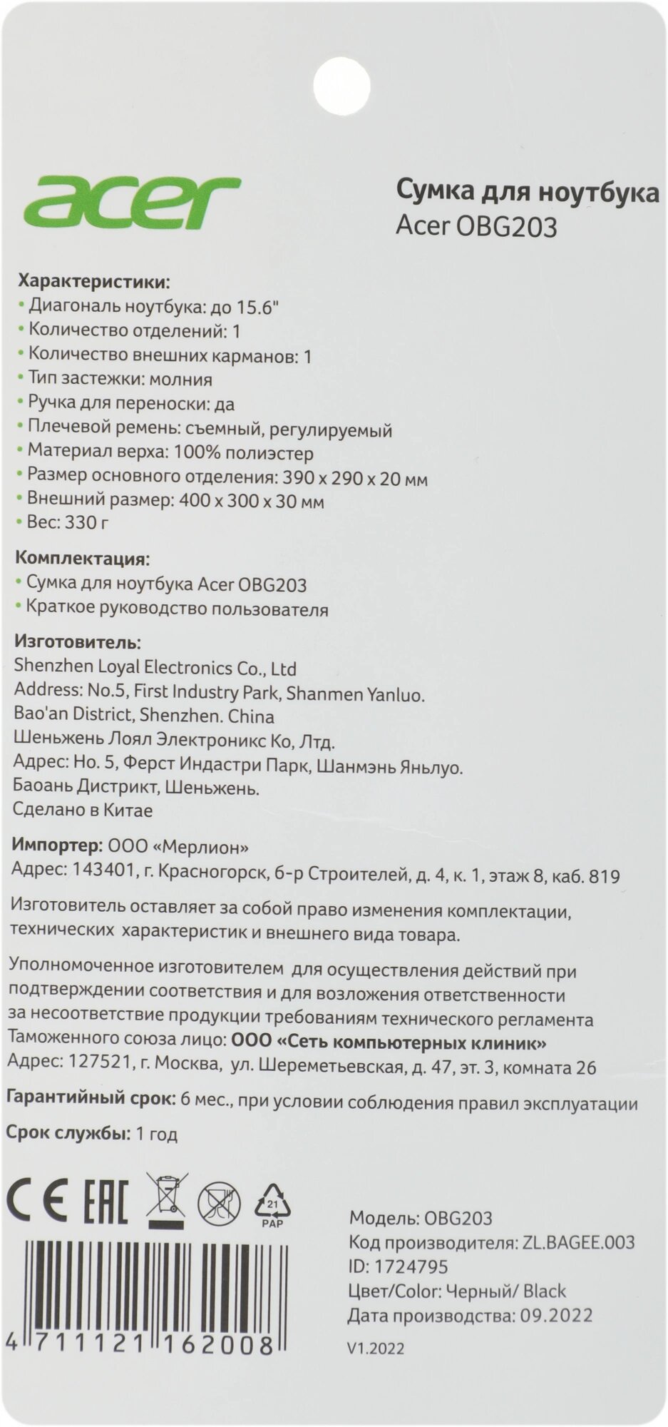 Сумка для ноутбука 15.6" Acer LS series OBG203, черный, Универсальный [zl.bagee.003]