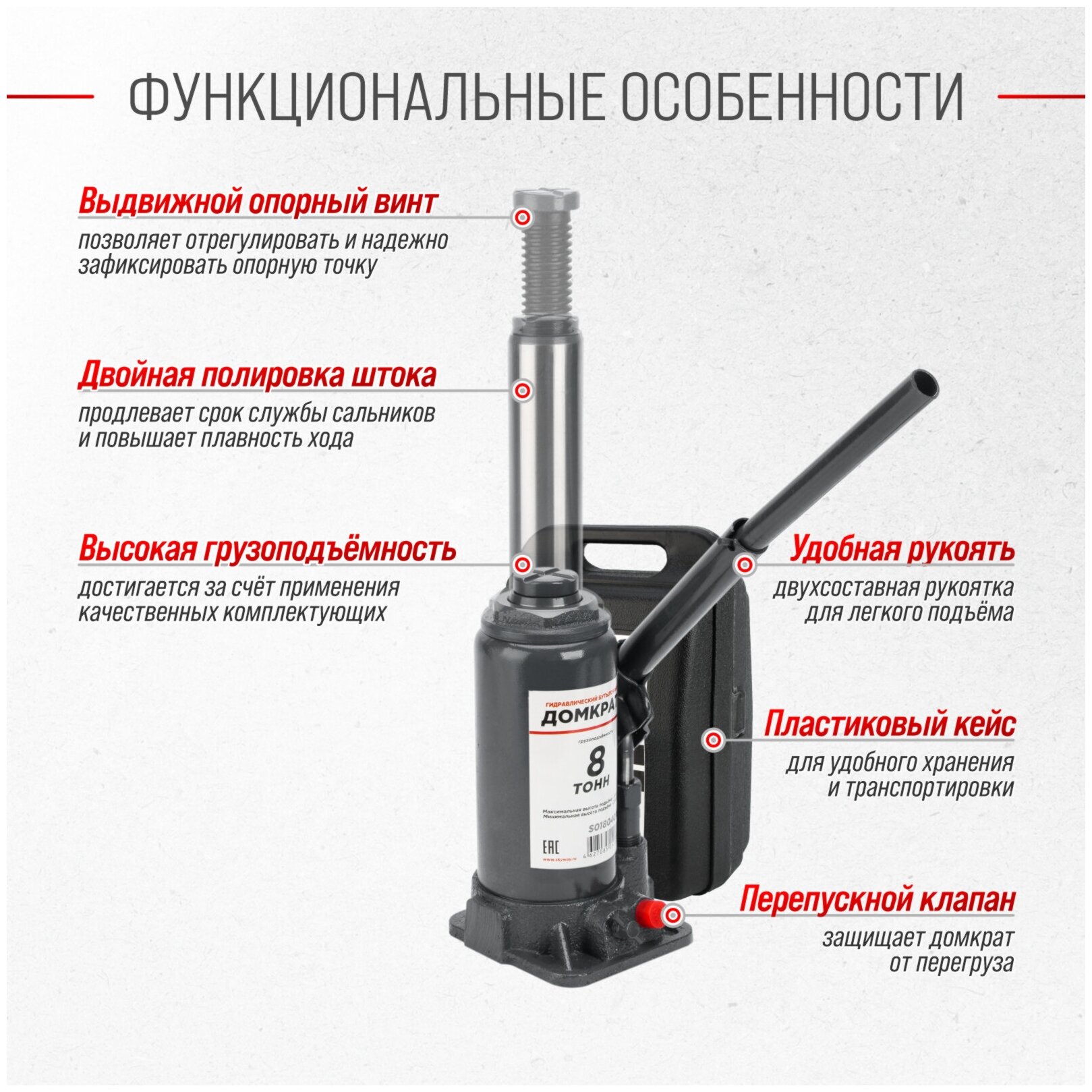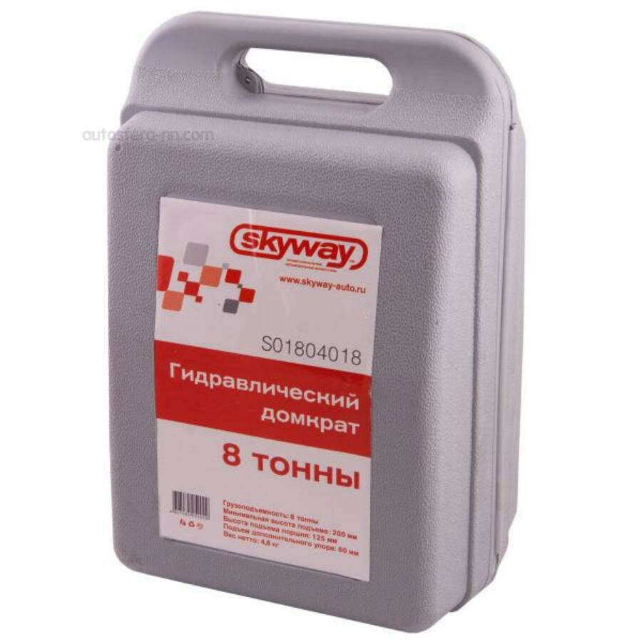 Домкрат бутылочный гидравлический 8т, высота 200-385 мм, клапан (кейс пластик) SKYWAY S01804018 интересное: