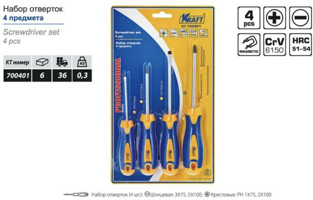 KRAFT KT 700401 Набор отверток 4 шт. (Блистер) 1шт