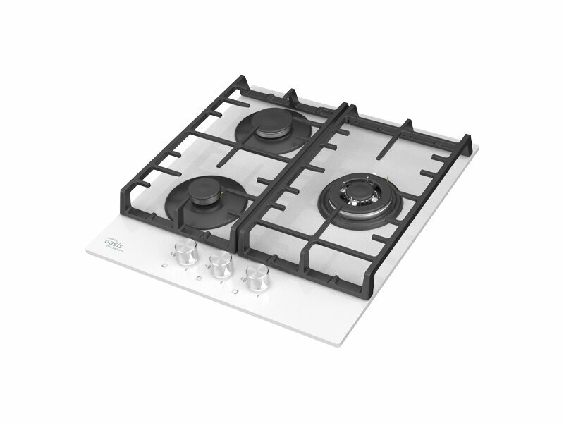 Варочная панель газовая встраиваемая Оазис P-3GWT закаленное стекло белый 98х460х520мм 3 конфорки 2 решетки электроподжиг / газконтроль / бытовая