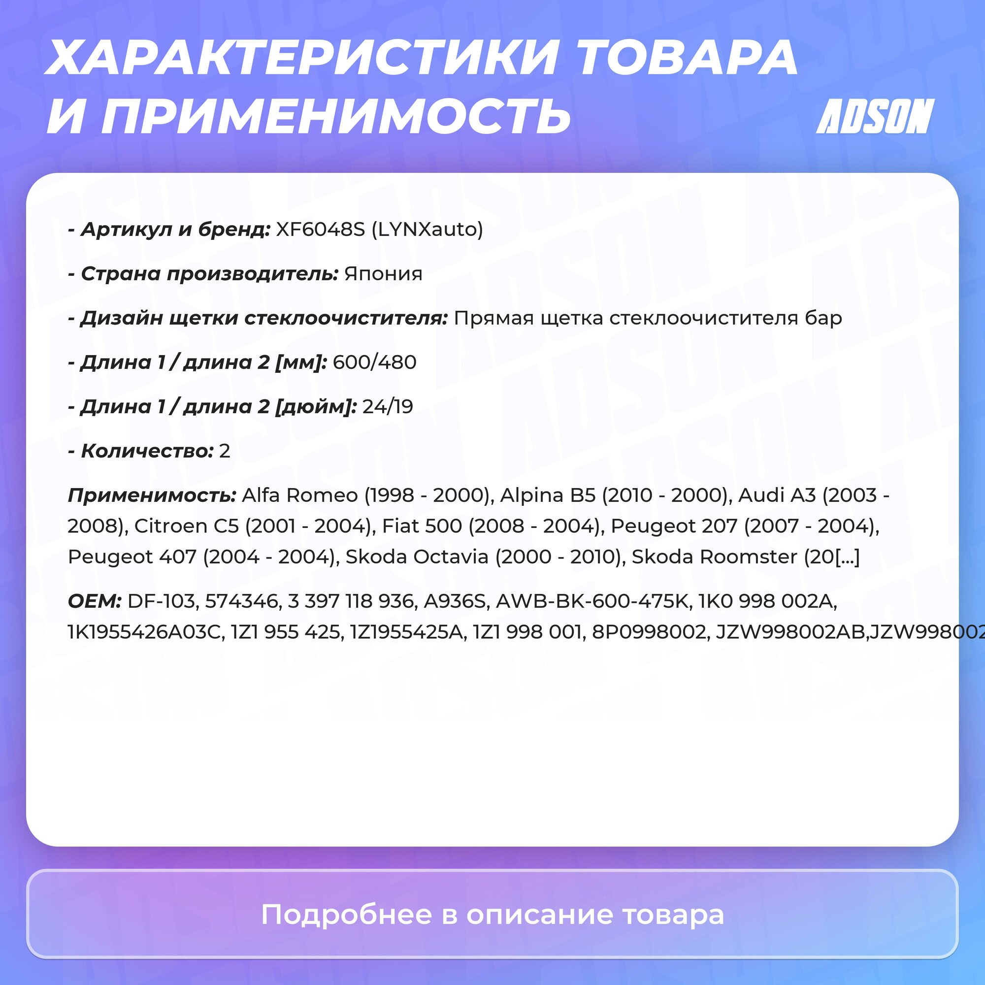 LYNXauto XF6048S (1004019 / 1004021 / 119301) бескаркасные щётки стеклоочистителя, комплект 530мм+480мм подходит