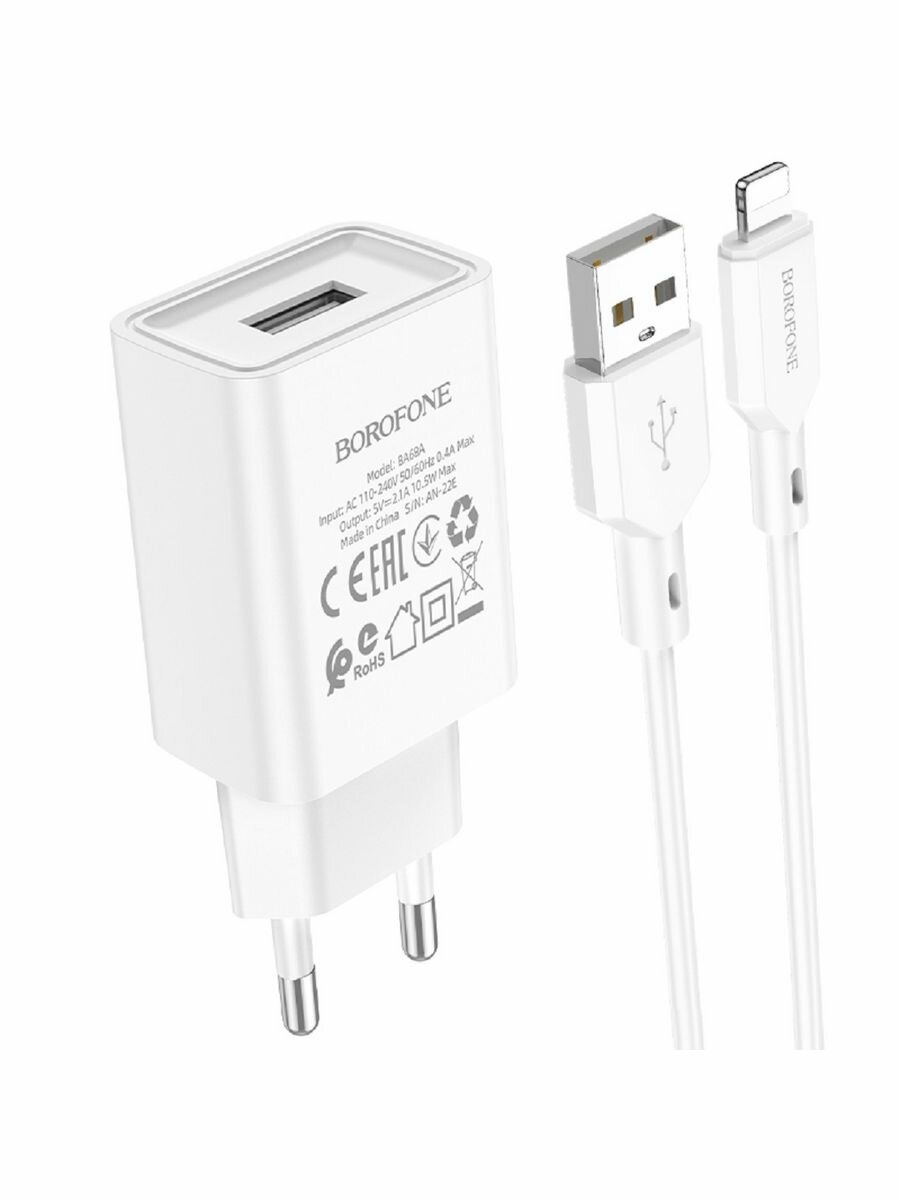 Сетевое зарядное устройство c USB Borofone, BA68A,+Lightning, белое, 2.1A