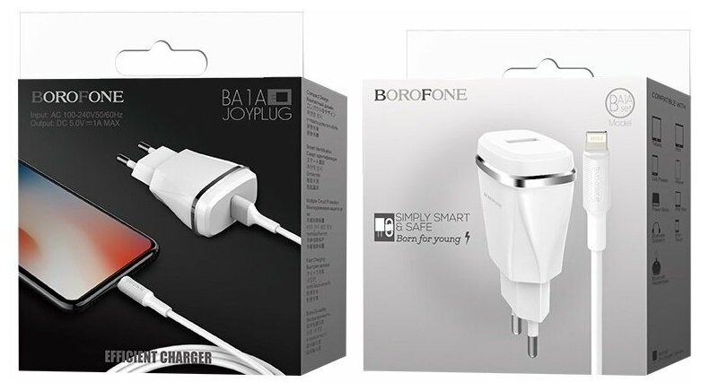 Сетевое зарядное устройство BOROFONE BA1A Joyplug 1xUSB с Кабелем USB - Lightning, 1A, белый интересное: