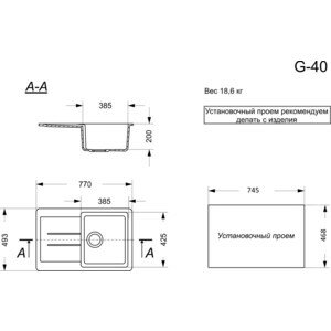 | Дополнительная информация | G-40 Односекционная реверсивная мойка Общий размер: 770х493 мм Размер чаши: 425х390х190 мм Установочный проем: 745х468 мм |