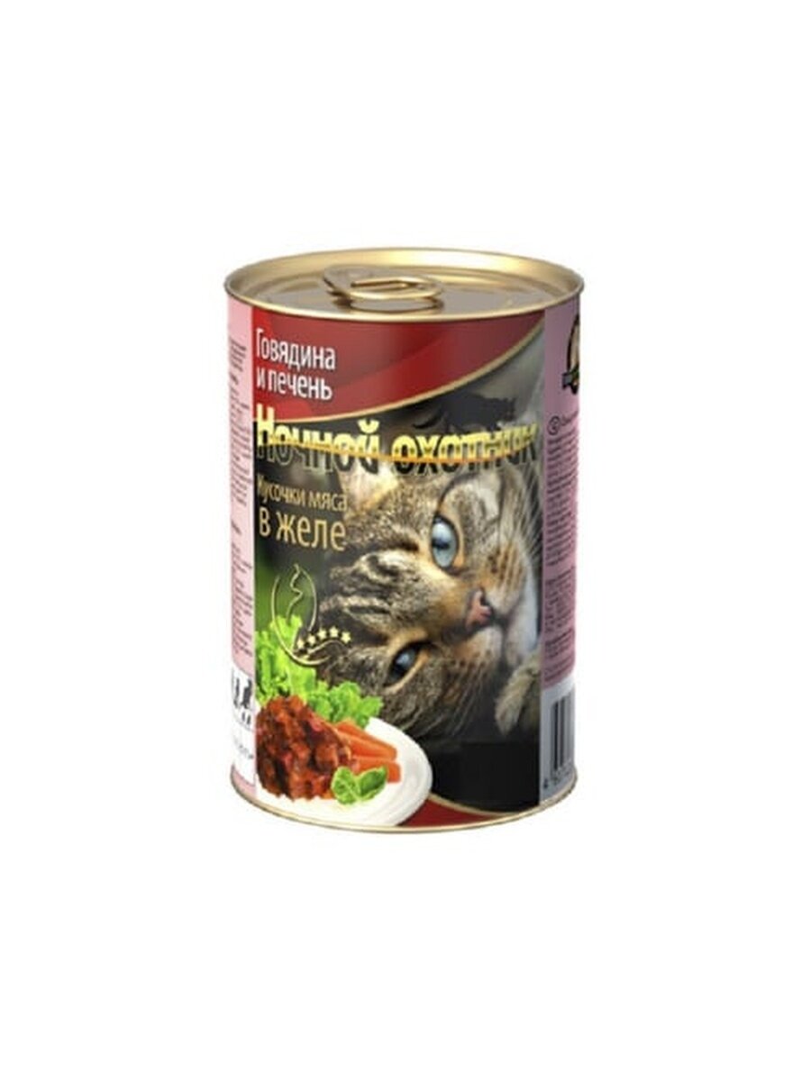 Консервированный корм для кошек Ночной охотник, говядина/печень кусочки в желе, 415 гр
