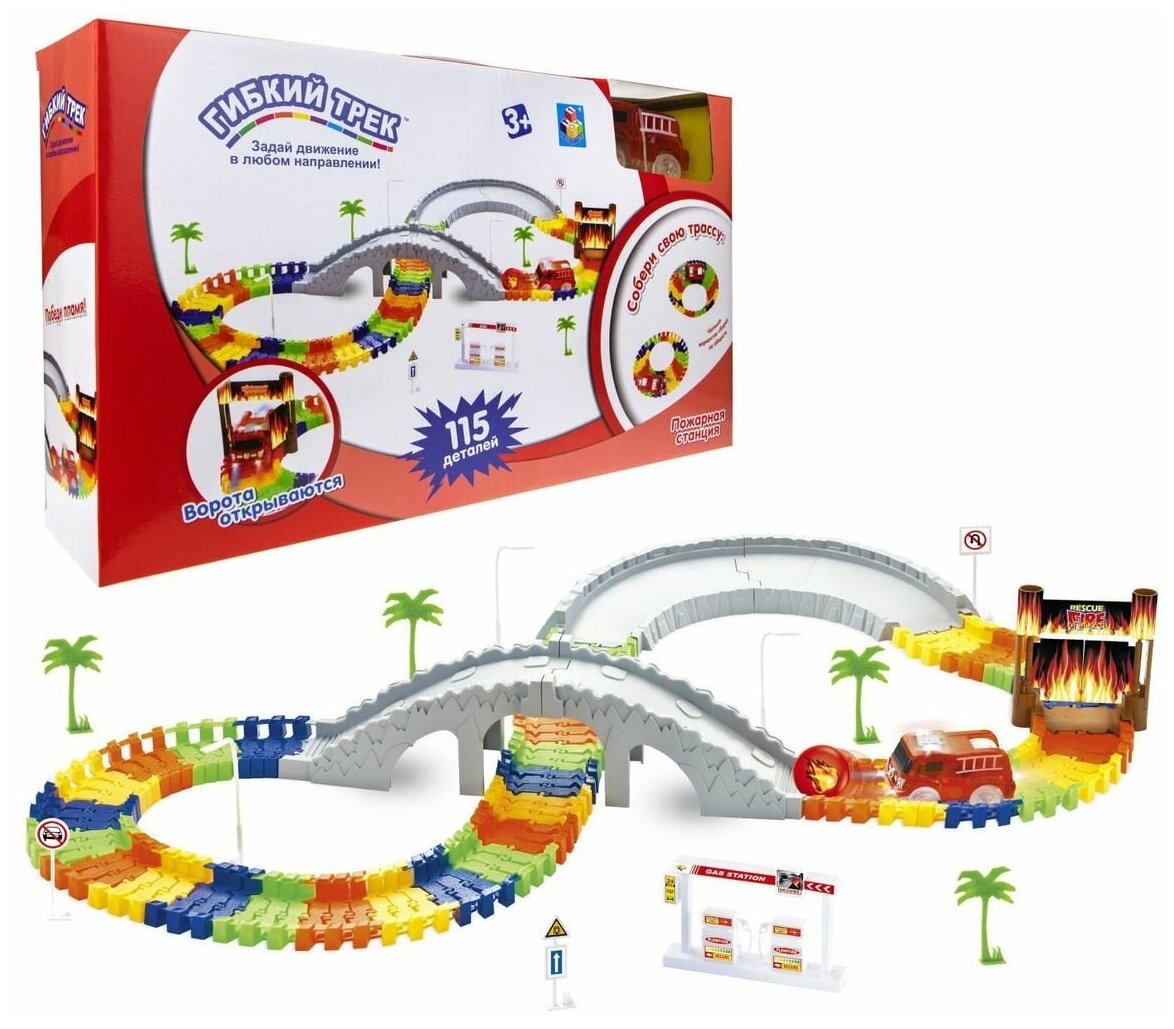 1toy Гибкий трек - пожарная станция мост, ворота, 1 машинка со светом, 115 дет