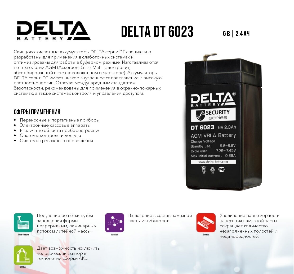 Аккумулятор Delta DT 6023 (75мм) 6V AGM (2,29 Ач)