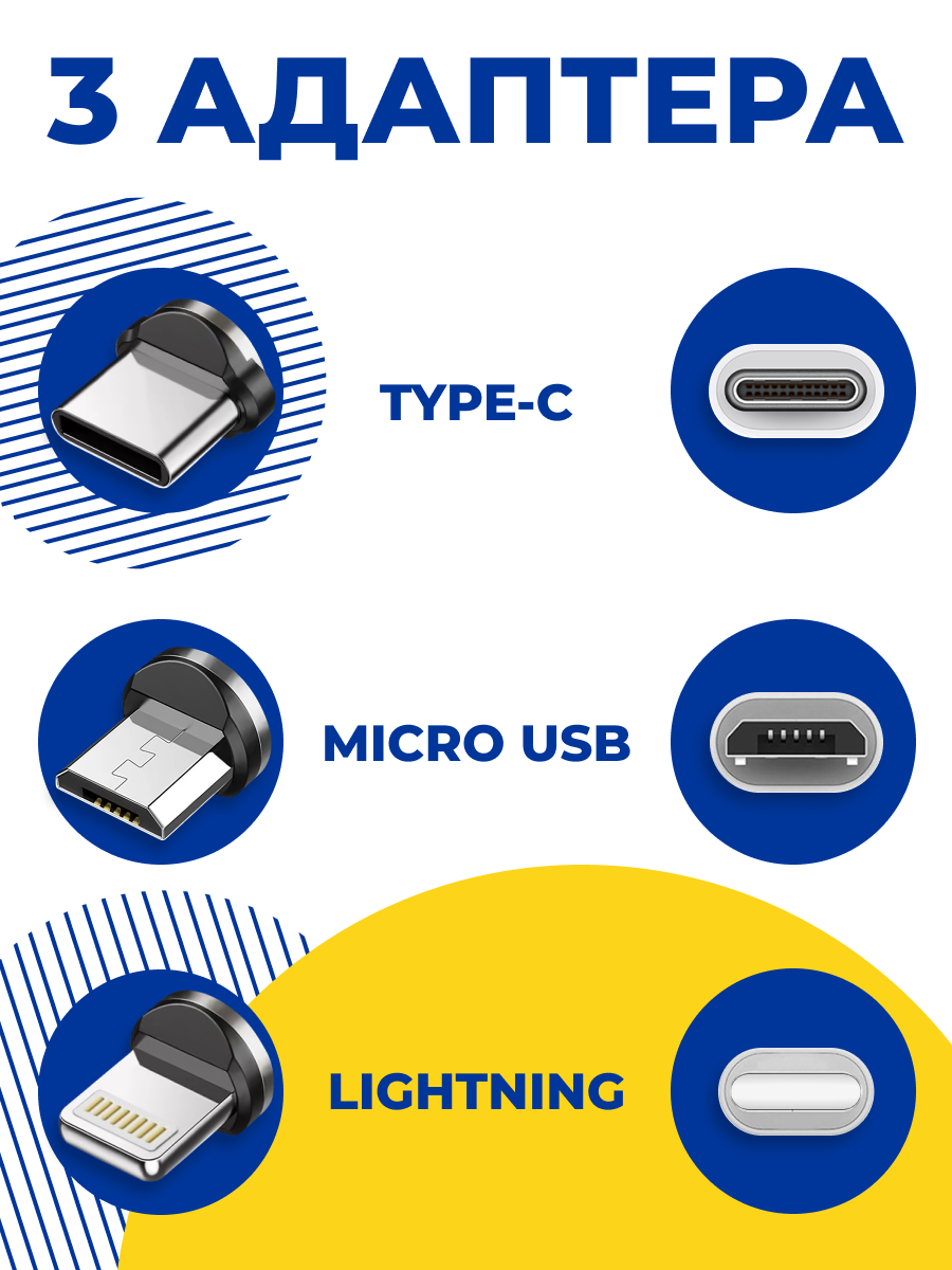 Магнитный кабель для зарядки 3 в 1, Type-C, Lightning, Micro USB / Провод на iPhone, Samsung, Android / Шнур 1 метр