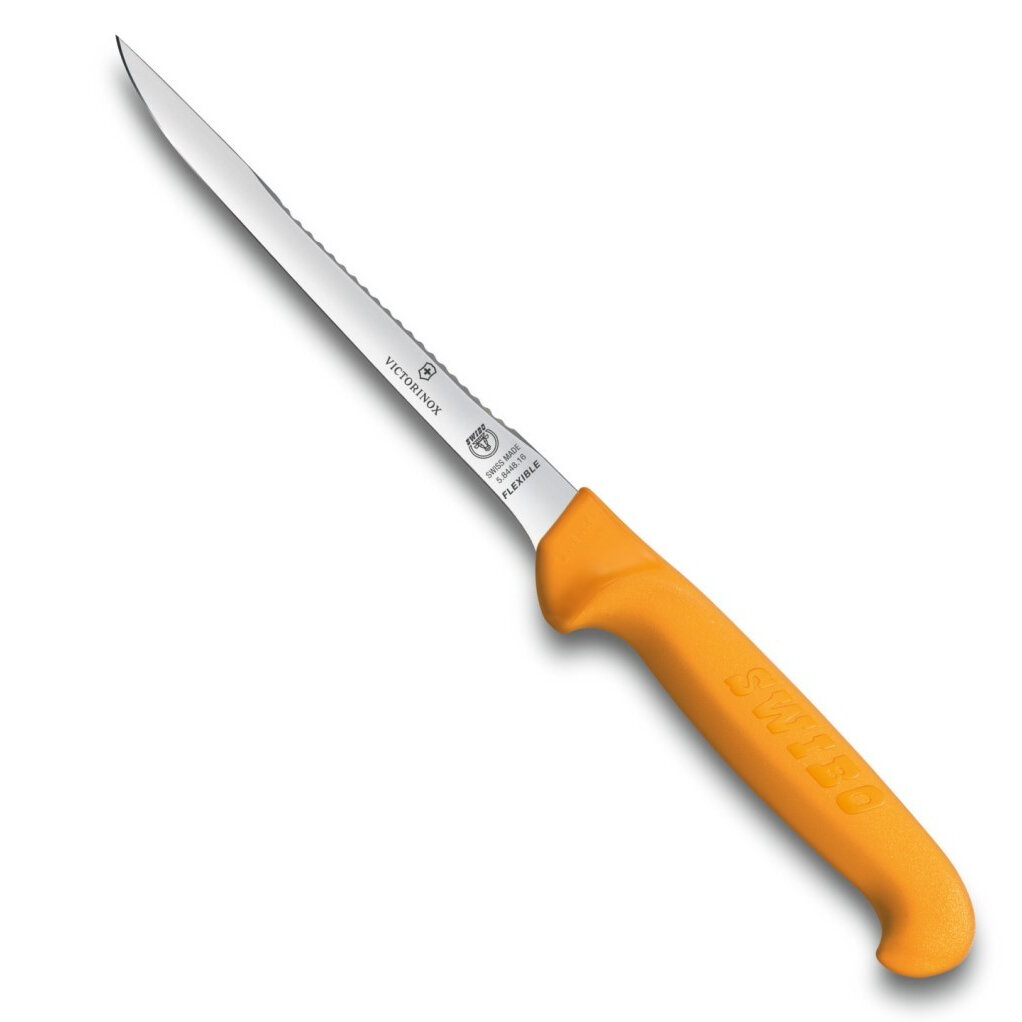 Нож для филировки рыбы VICTORINOX Swibo, узкое гибкое лезвие 16 см с рыбочисткой, жёлтый