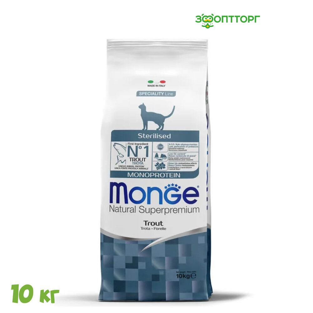 Купить Monge Cat Monoprotein Sterilised Trout корм для стерилизованных кошек Форель, 10 кг.