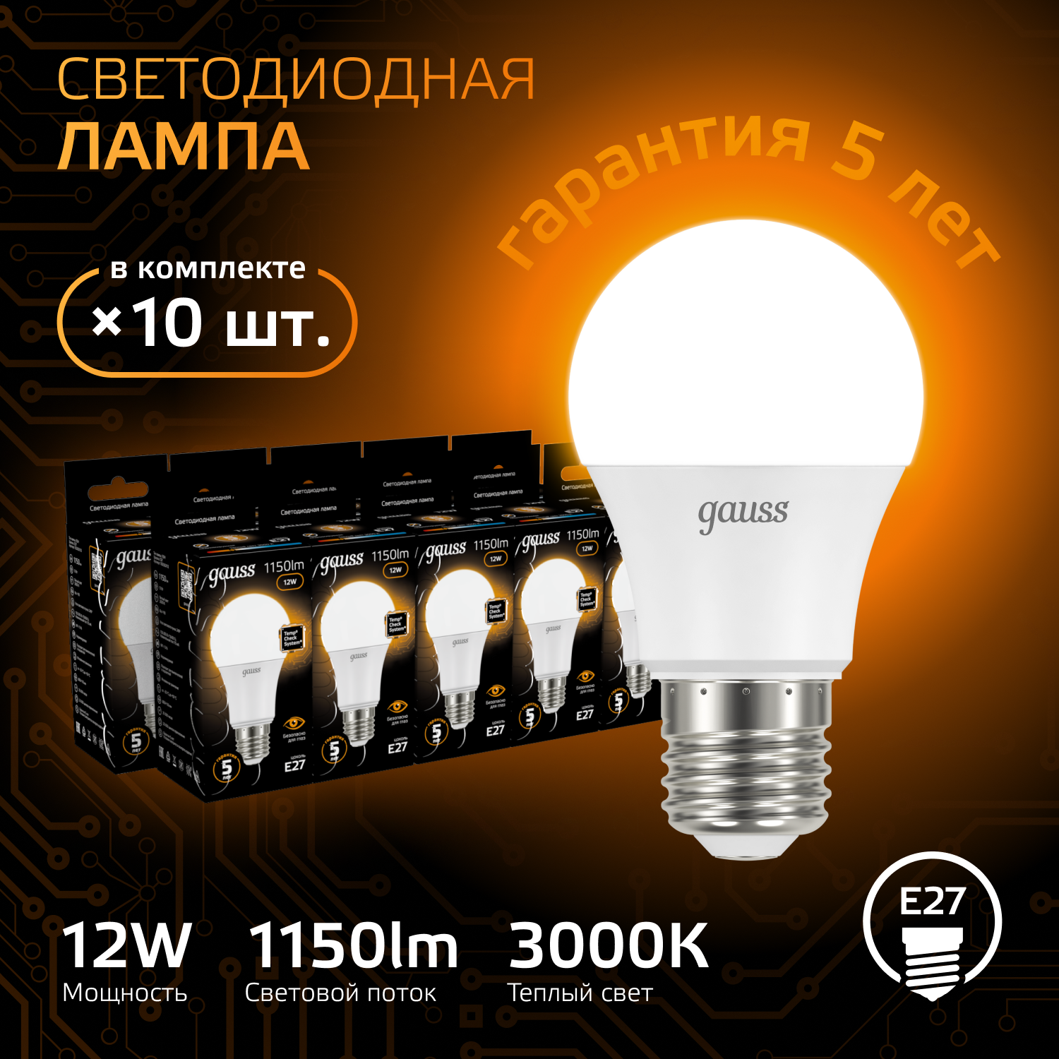 Упаковка ламп LED GAUSS E27, шар, 12Вт, 3000К, белый теплый, A60, 10 шт. [102502112]