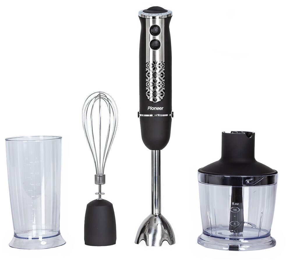 Блендер погружной с измельчителем Pioneer, покрытие Soft Touch, 3 насадки, 5 скоростей, режим Турбо, измельчение льда, 1200 Вт