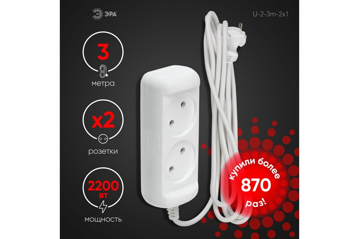 Удлинитель ЭРА 3м 2 розетки, белый (U-2-3m-2x1) 1329379