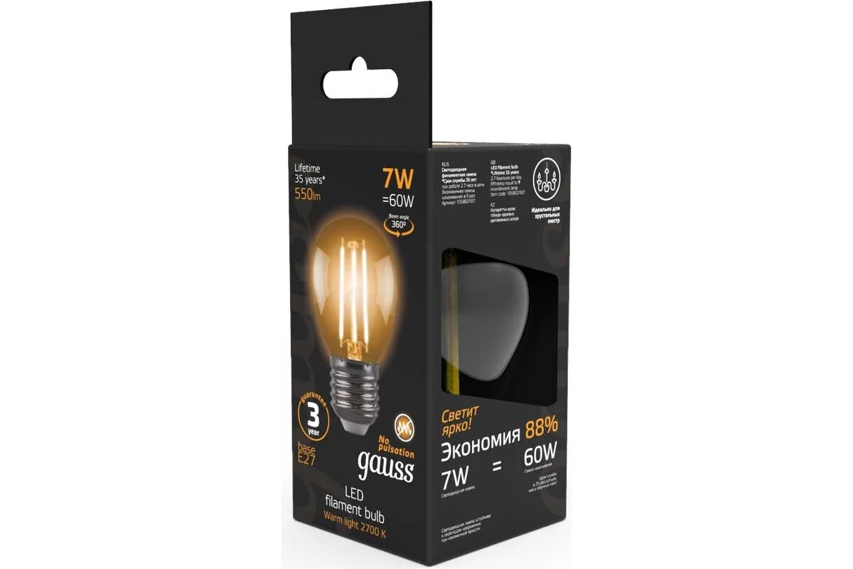СохранитьЛампа светодиод 7Вт Шар Е27 2700К 550Лм филамент прозр Gauss Filament интересное: