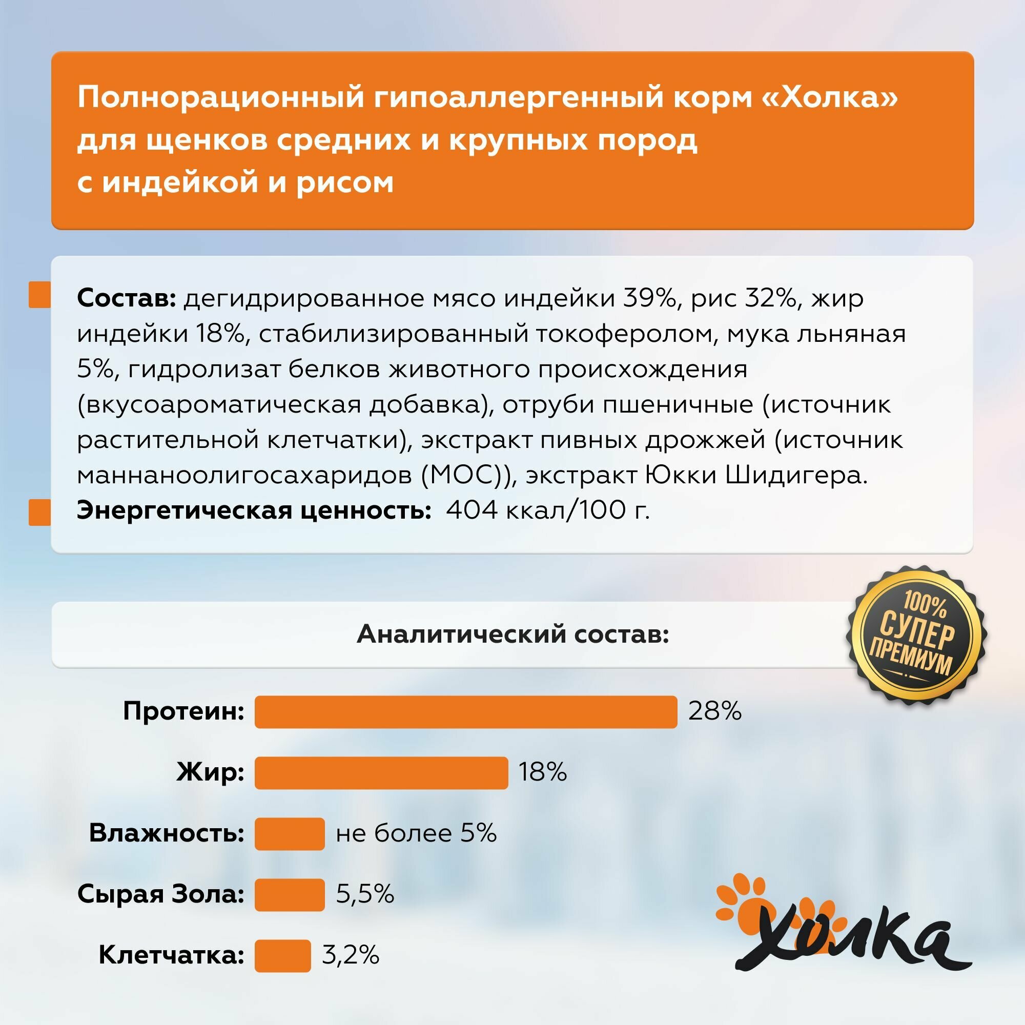 Холка гипоаллергенный сухой корм для щенков средних и крупных пород с индейкой и рисом - 7 кг