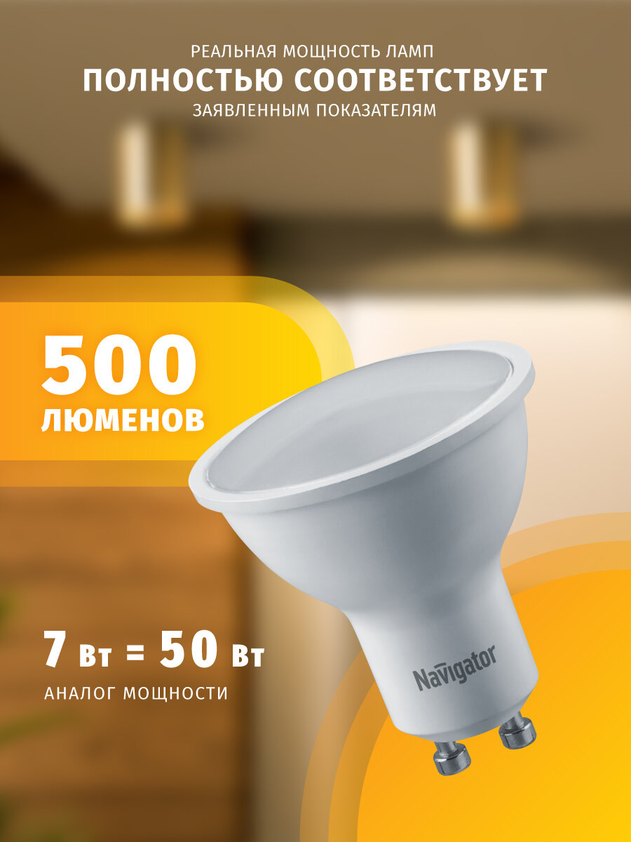(7 шт.) Светодиодная лампочка Navigator PAR16, мощность 7 Вт, напряжение питания 220 В, цветовая температура 3000 K, теплый белый свет, цоколь GU10, размер 50х59 мм, NLL-PAR16-7-230-3K-GU10