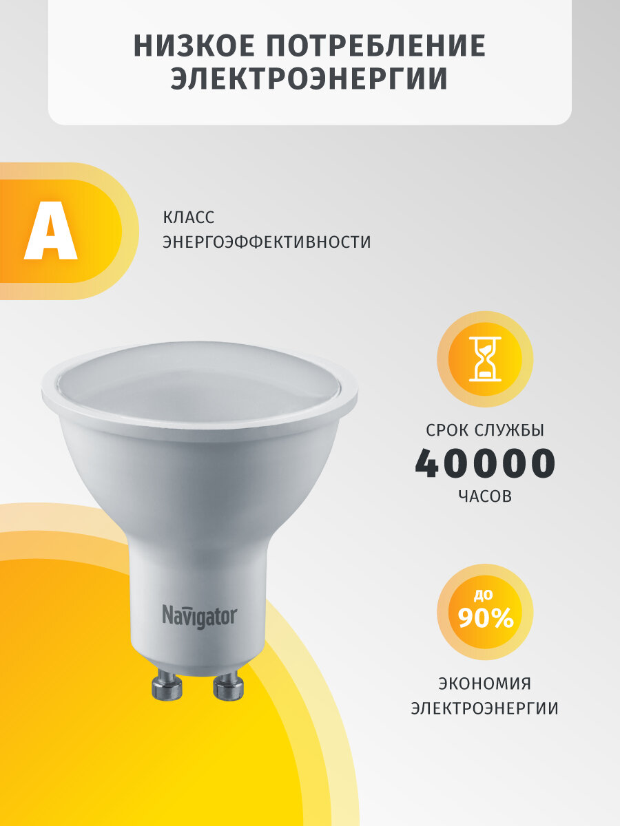 (10 шт.) Светодиодная лампочка Navigator PAR16, мощность 5 Вт, напряжение питания 220 В, цветовая температура 3000 K, теплый белый свет, цоколь GU10, размер 50х59 мм, NLL-PAR16-5-230-3K-GU10