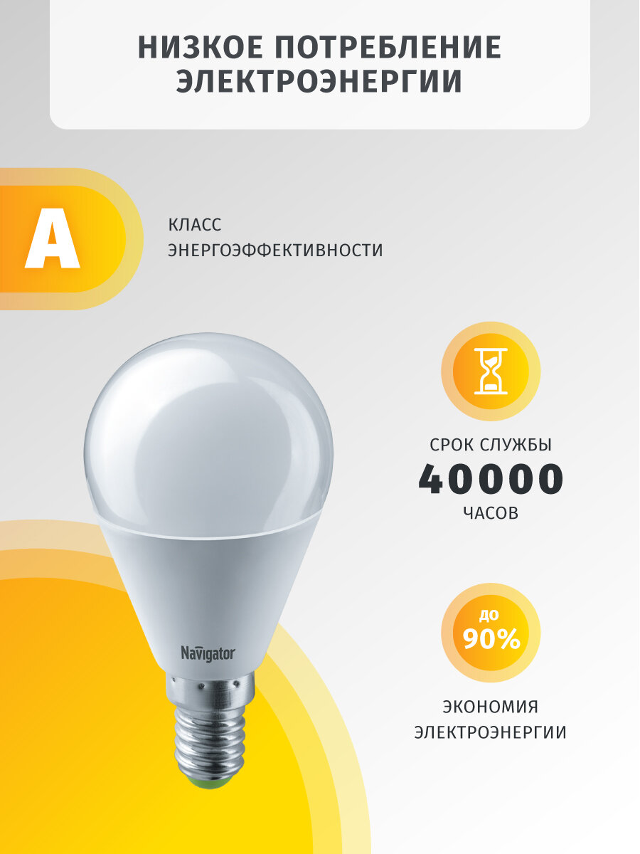 (6 шт.) Светодиодная лампочка Navigator G45, мощность 5 Вт, напряжение питания 220 В, цветовая температура 2700 K, теплый белый свет, световой поток 385 Лм, цоколь E14, размер 45х83 мм