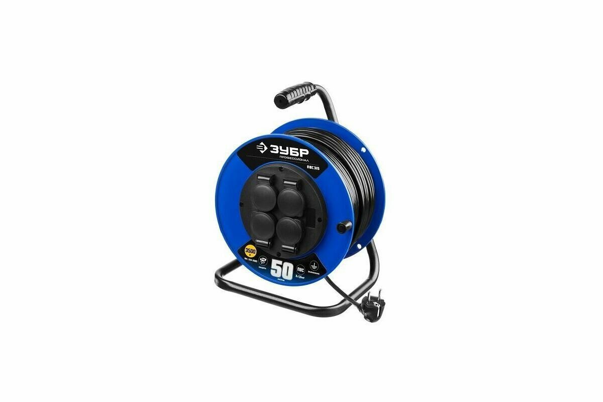 Удлинитель на катушке ЗУБР 55081-50, 4 розетки, с/з, 16А / 3500 Вт голубой 50 м 26 мм 21 мм 36 мм 1.5 м² 4
