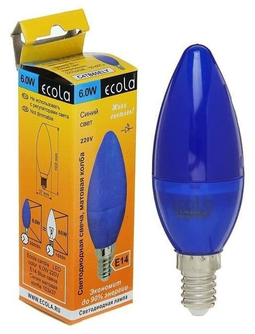 Светодиодная лампа Ecola candle LED color 6,0W 220V E14 Blue свеча Синяя матовая колба 103x37 C4TB60ELY интересное: