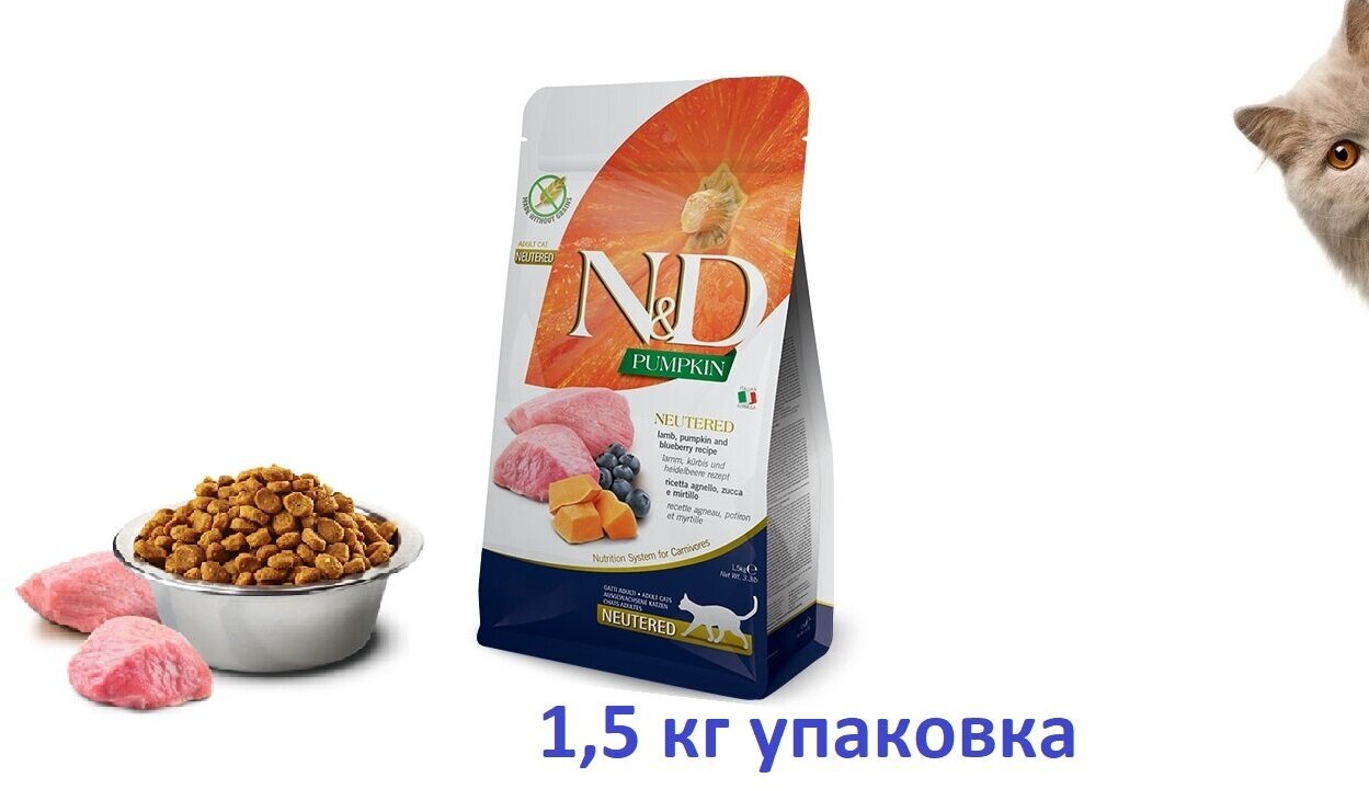 FARMINA CAT N&D GRAIN FREE PUMPKIN NEUTERED LAMB & BLUEBERRY беззерновой для взрослых кастрированных котов и стерилизованных кошек с ягненком, черникой и тыквой (1,5 кг)