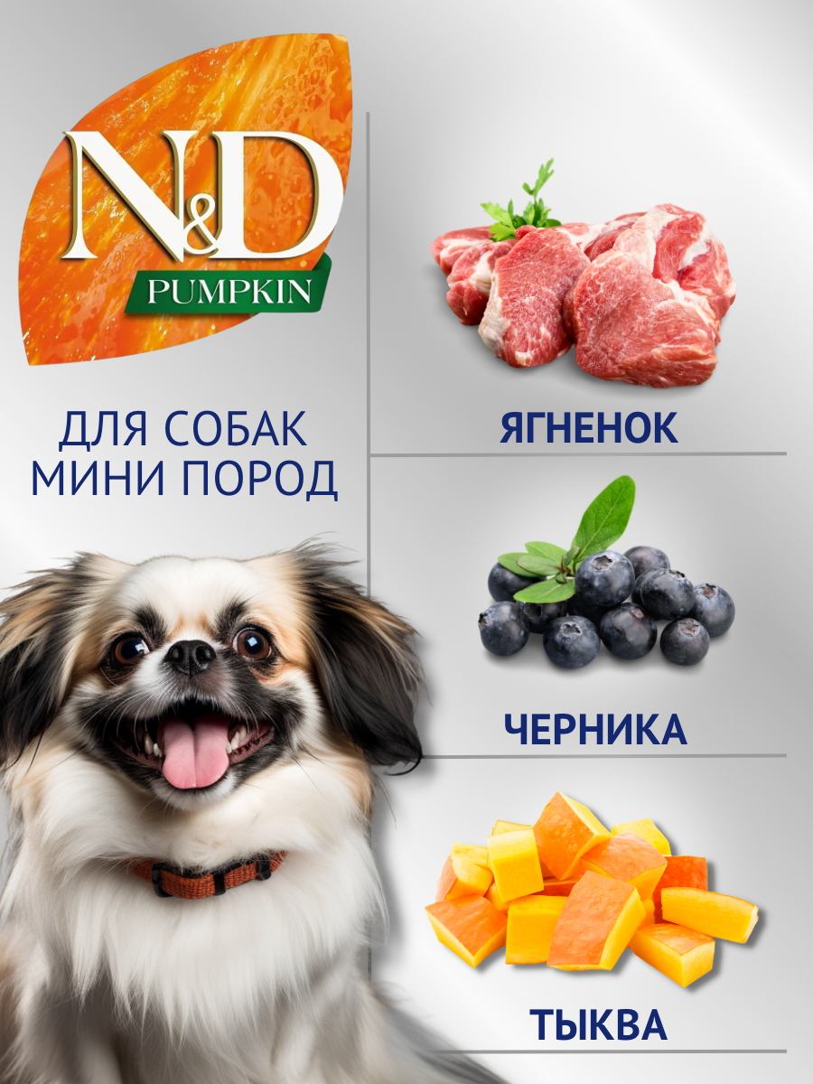 Корм для собак сухой Фармина N&D Pumpkin Mini Adult Беззерновой для мелких пород животных, гранулы с ягненком, черникой и тыквой 2.5кг /