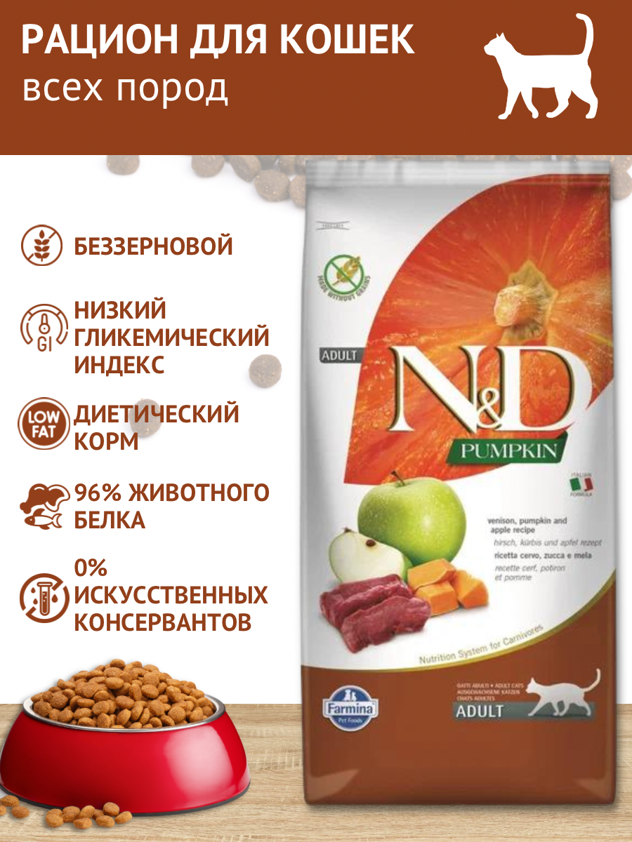 Farmina n&d gf pumpkin беззерновой корм для взрослых кошек (оленина и яблоко с тыквой)