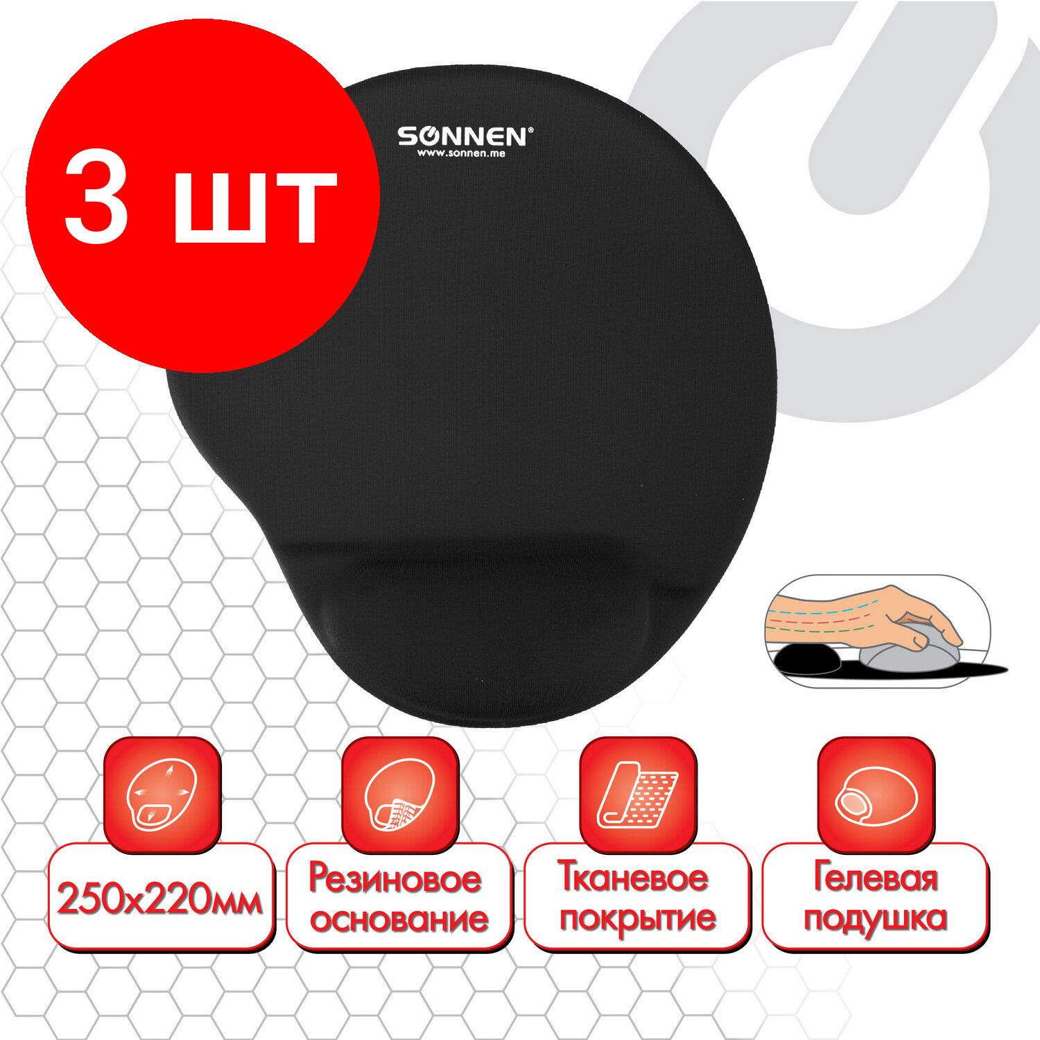 Купить Комплект 3 шт, Коврик для мыши с подушкой под запястье SONNEN, полиуретан + лайкра, 250х220х20мм, черный, 513299