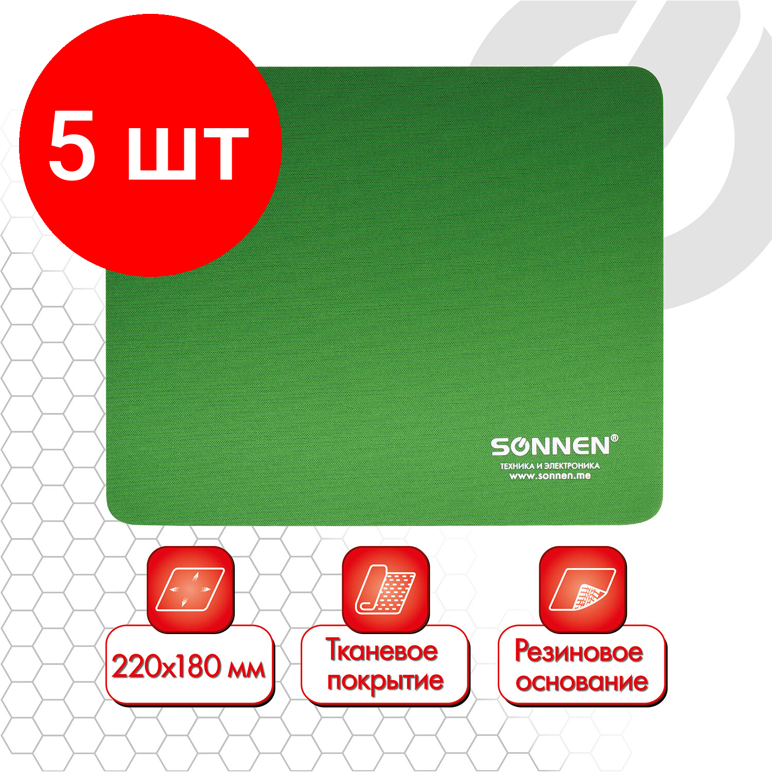 Купить Комплект 5 шт, Коврик для мыши SONNEN "GREEN", резина + ткань, 220х180х3 мм, 513305