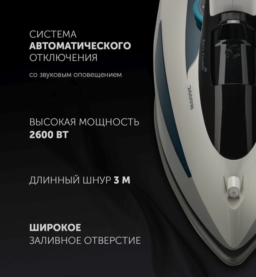 | Плюсы: | Быстро нагревается, длинный шнур,удобное жерло для залива воды, мощный пар |