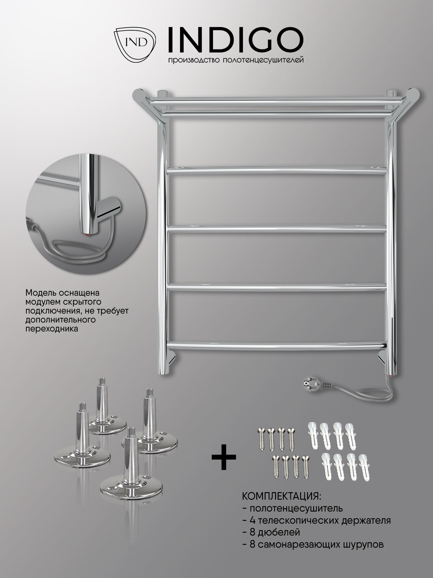 Полотенцесушитель электрический INDIGO Arc с полкой 60/50 скрытый монтаж, универсальное подключение