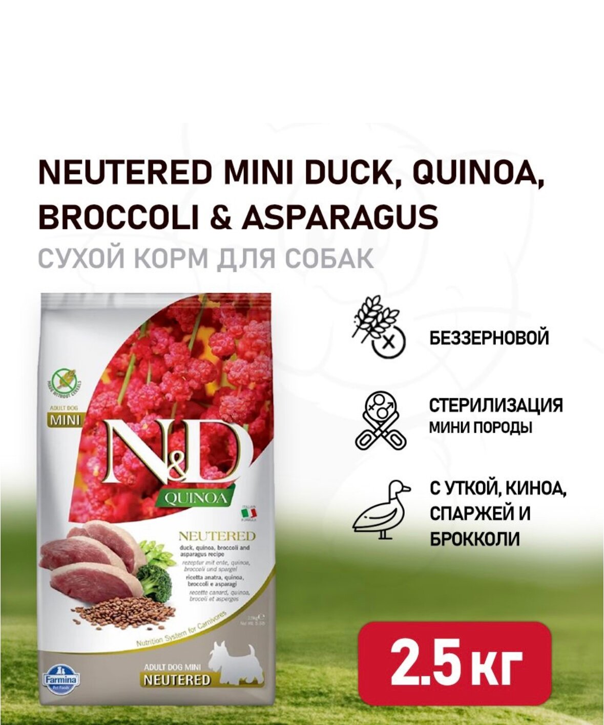 FARMINA DOG N&D QUINOA NEUTERED ADULT MINI DUCK, BROCCOLI & ASPARAGUS беззерновой для для кастрированных и стерилизованных взрослых собак маленьких пород с уткой, брокколи и спаржей (2,5 кг)