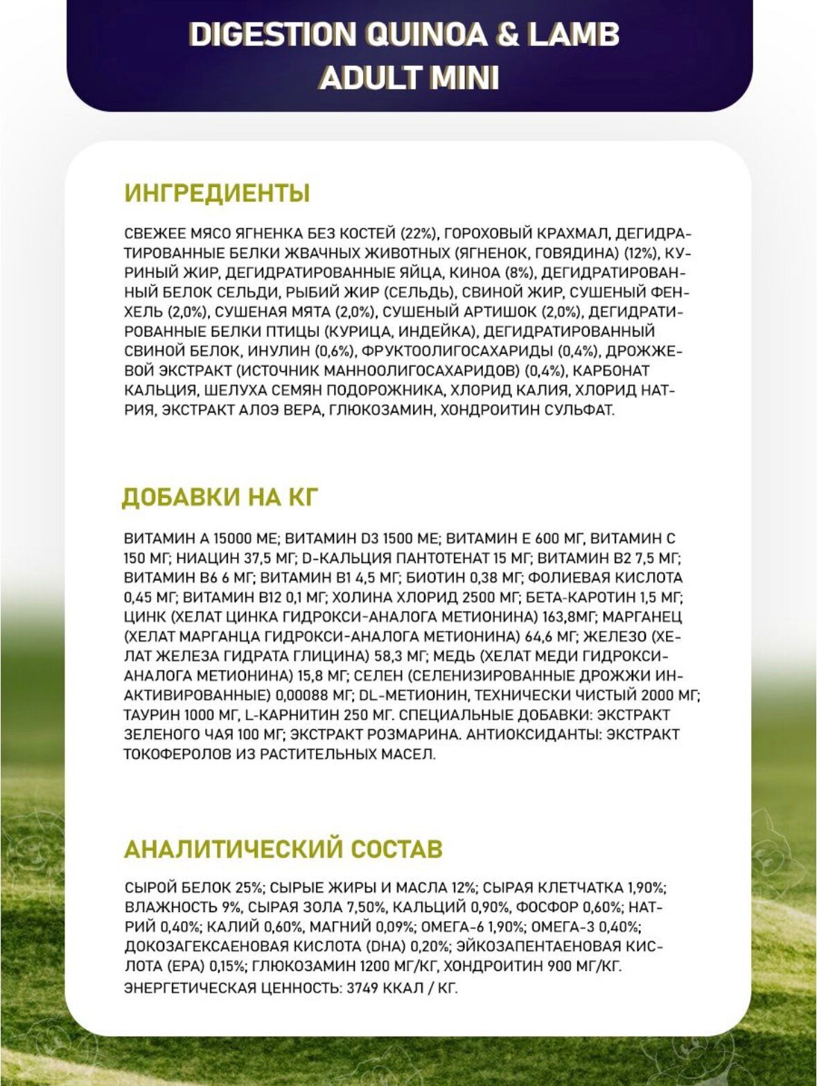 | Состав | свежее мясо ягненка без костей (22%), гороховый крахмал, дегидратированное мясо ягненка (12%), куриный жир, дегидратированные цельные яйца, киноа (8%), дегидратированная сельдь, рыбий жир (сельди), сушеный фенхель (2,0%), сушеная мята (2,0%), сушеный артишок (2,0%), инулин (0,6%), фруктоолигосахариды (0,4%), дрожжевой экстракт (источник маннанолигосахаридов) (0,4%), карбонат кальция, подорожник (0,3%), хлорид калия, хлорид натрия, глюкозамин, хондроитин сульфат |