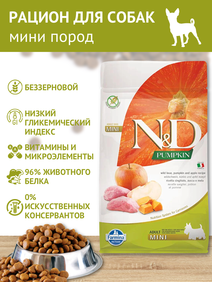 Фармина 33291 N&D PUMPKIN Adult Mini корм беззерновой д/собак мелких пород с мясом Кабана, тыквой и яблоком 2,5кг
