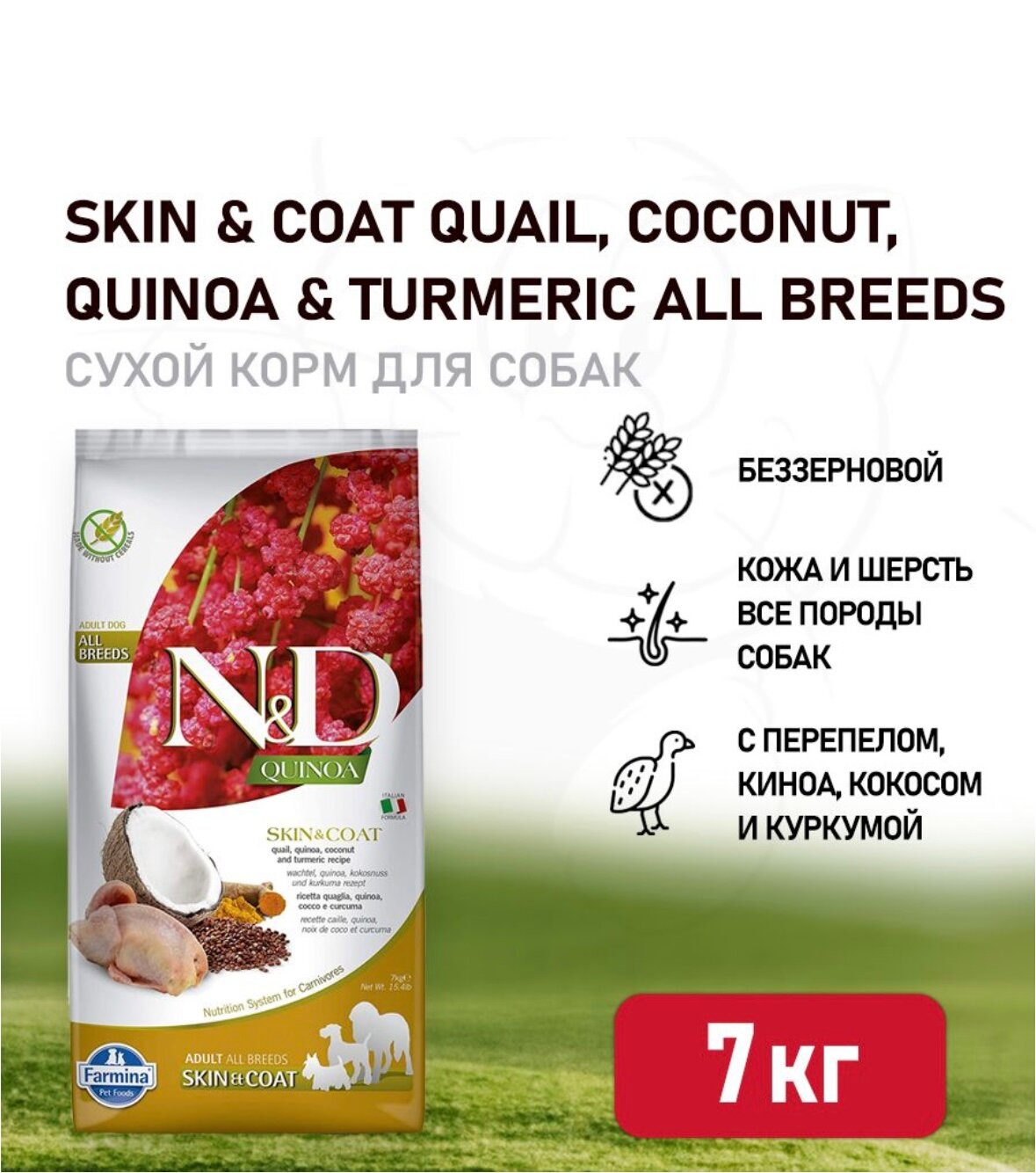 Сухой беззерновой корм с перепелом и киноа, уход за кожей и шерстью, для собакFarmina N&D Quinoa Skin&Coat, 7 кг