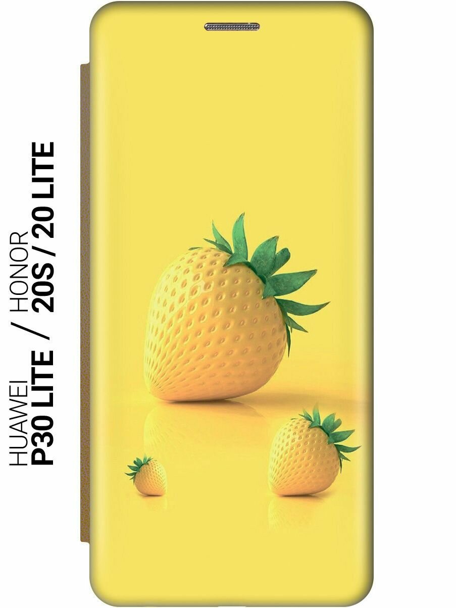Чехол-книжка на Honor 20 Lite / 20s / Huawei P30 Lite / Хуавей П30 Лайт / Хонор 20 Лайт / 20s c принтом "Желтая клубника" золотистый