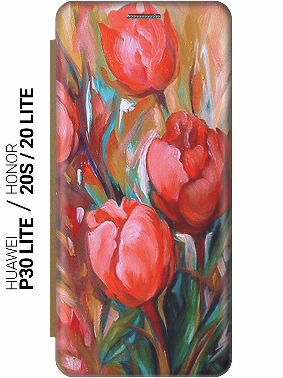Чехол-книжка на Honor 20 Lite / 20s / Huawei P30 Lite / Хуавей П30 Лайт / Хонор 20 Лайт / 20s c принтом "Тюльпаны" золотистый