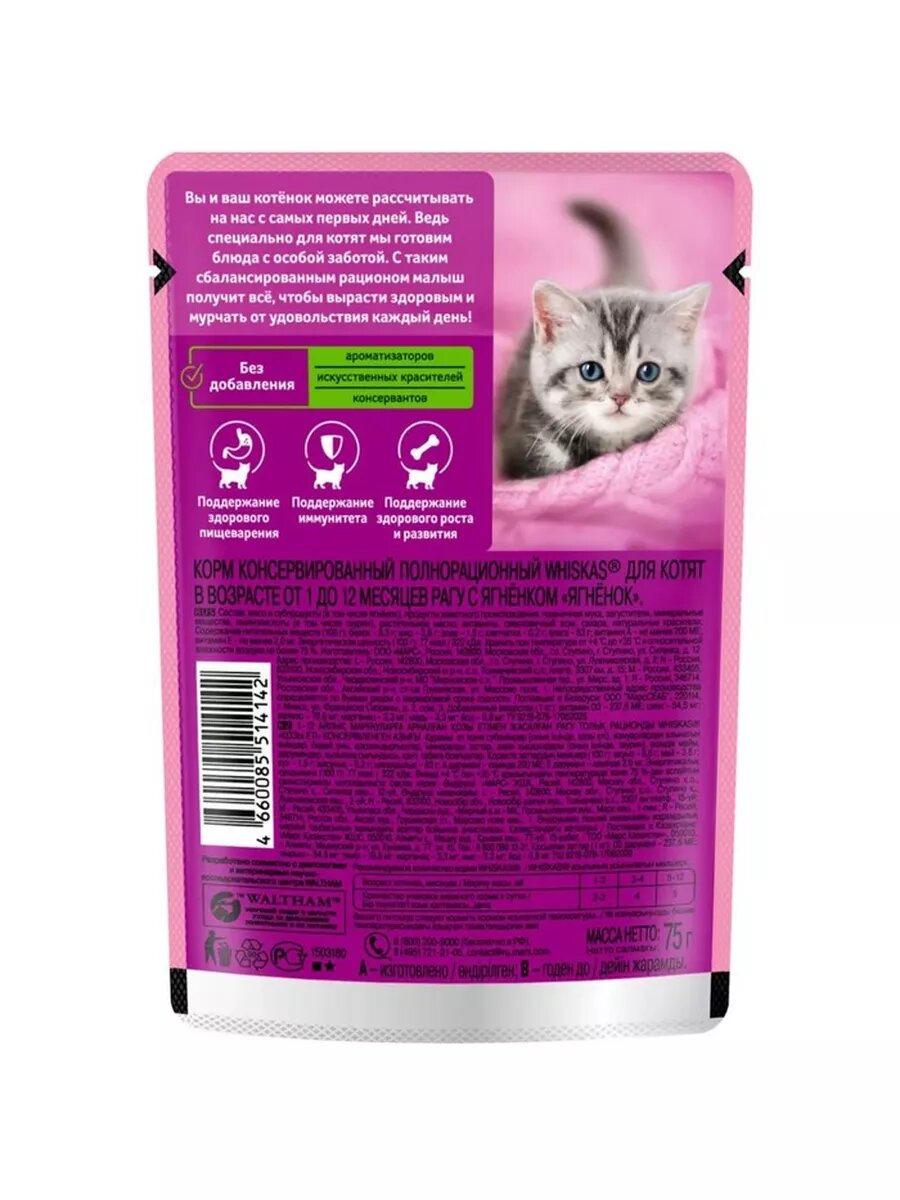Whiskas Влажный корм для котят от 1 до 12 месяцев рагу с ягненком 75г 1023328910244743 0,075 кг 53665 (34 шт)