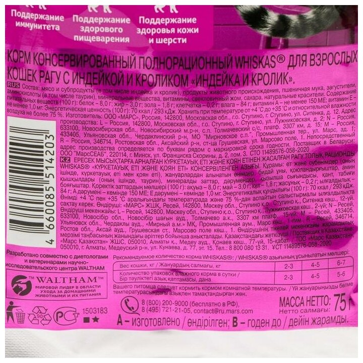 Whiskas пауч для кошек (рагу) Индейка и кролик, 75 г. упаковка 28 шт