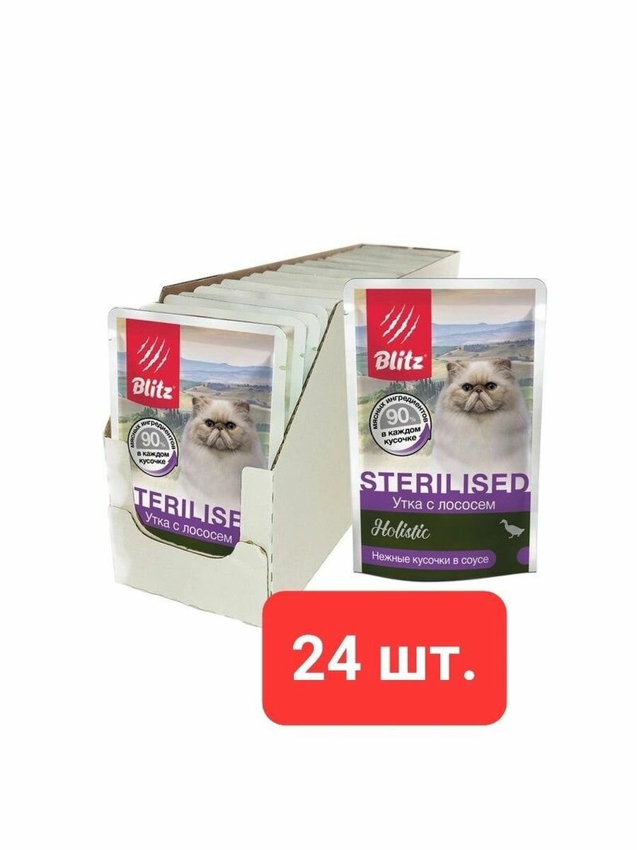 Корм влажный Blitz (pet) Blitz Holistic для стерилизованных кошек и кастрированных котов Утка с лососем в соусе, 24шт х85 г