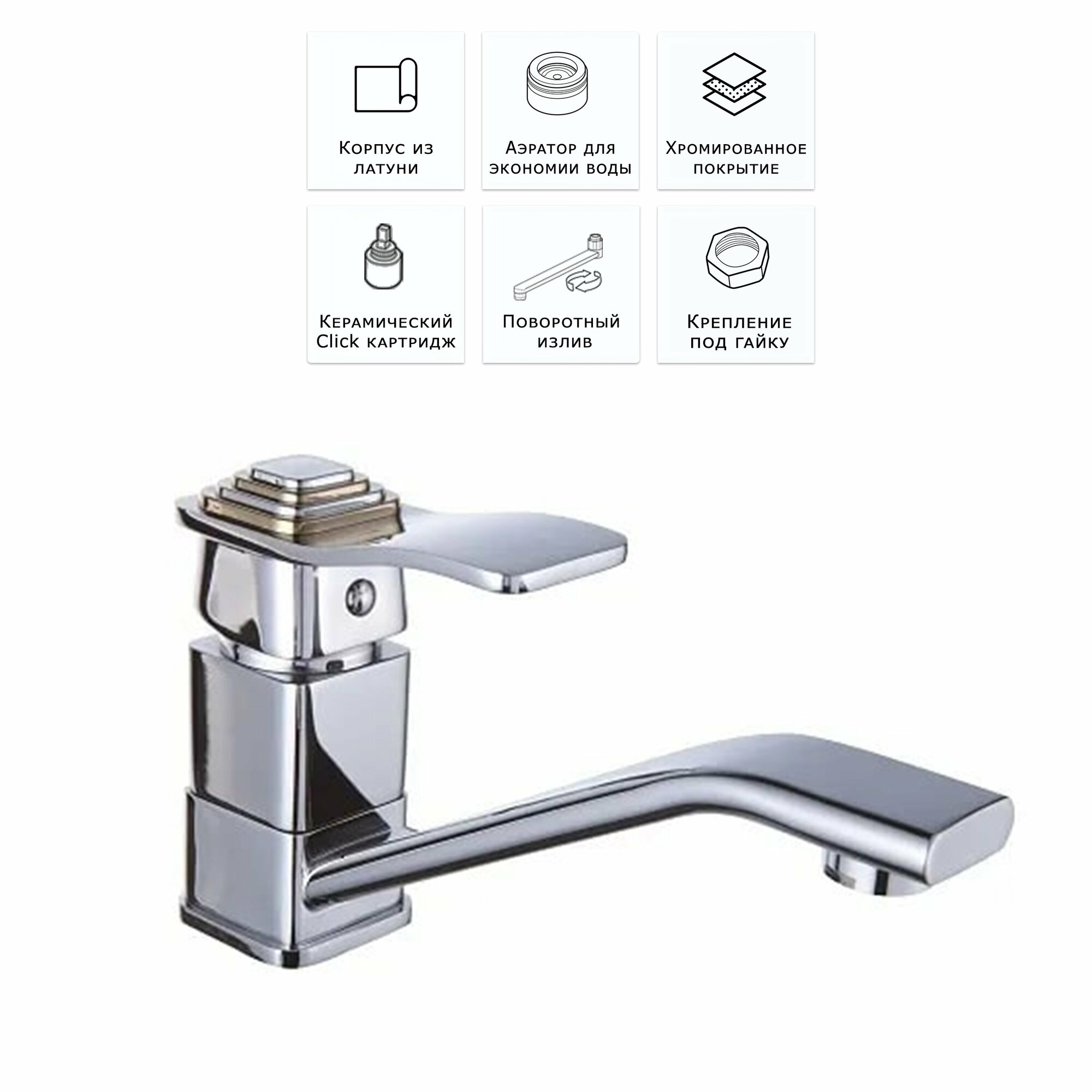 | Комплектация | · Аэратор латунный с функцией легкой очистки · Поворотный излив · Картридж керамический – 35 мм · Гибкая подводка 45 см – 2шт · Kpeпление гайка |