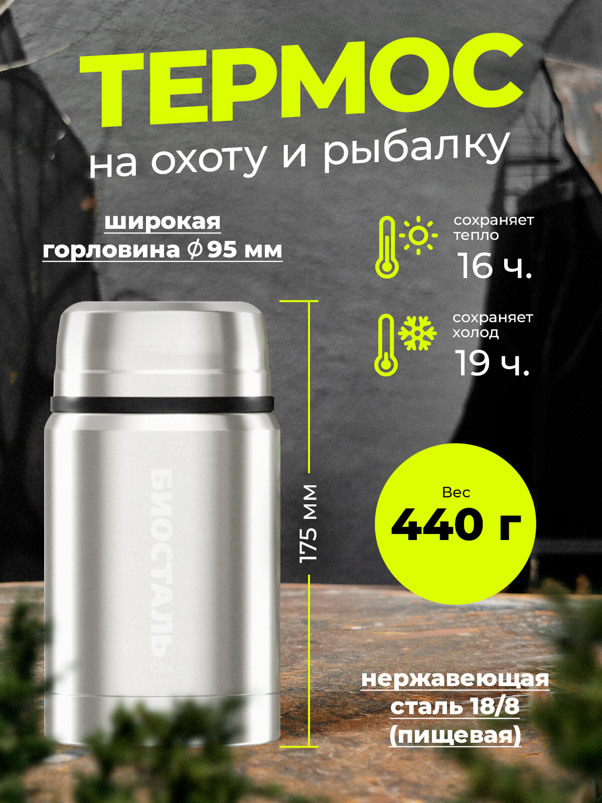 Термос Охота, Вакуумный суповой, широкое горлышко, термочехол с ложкой Биосталь/Biostal (0.5),NTS-500B