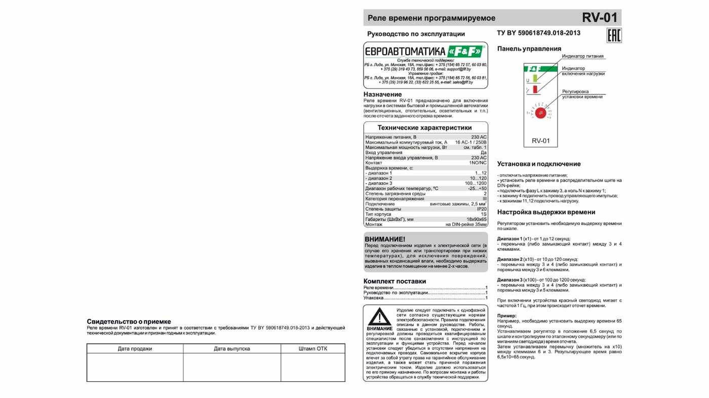 Реле времени RV-01 230В 16А задержка включ. 1..1200с 1перекл. IP20 монтаж на DIN-рейке F&F EA02.001.007 интересное: